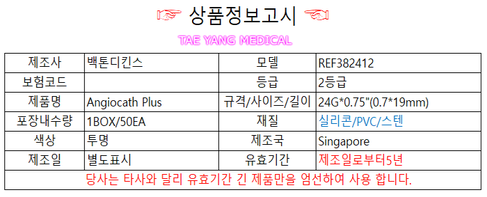 > BD 엔지오플러스 24G x 0.75인치 I.V카테타 정맥용혈관내튜브 50EA 382412