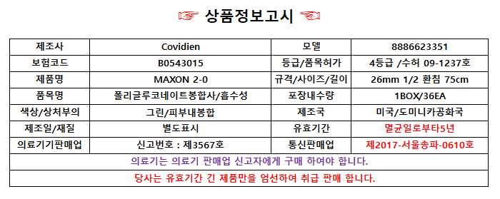 - HOME > 봉합사(침)/수술용실 > 폴리글루코네이트/흡수성봉합사 > USP 2-0 > 코비디엔 6233-51 MAXON 맥손 2/0 26mm1/2 라운드 75cm 36EA