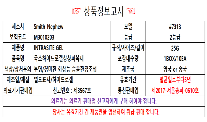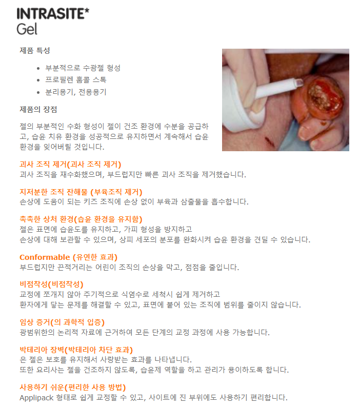 - HOME > 창상피복제/방수밴드 > 겔타잎 > 25G > 스미스앤드네퓨 인트라사이트 겔 25Gx10EA 창상피복재 욕창 찰과상 국소 하이드로 습윤겔