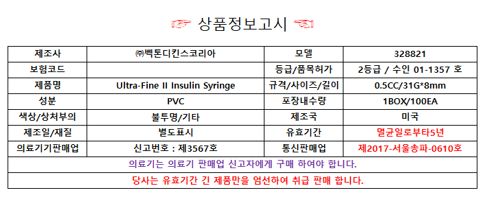 - HOME > 주사기/주사침 > 인슐린주사기 > 0.5cc/0.5ml > BD 울트라파인 II 인슐린주사기 0.5CC 31G x 8mm 10EA 1팩 328821