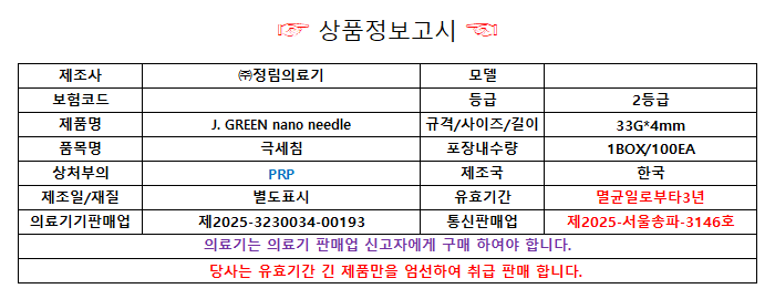 - HOME > 나노캐뉼라/나노니들 > 나노니들 > 33G > 정림의료기 나노니들 33G x 4mm 일회용 멸균 극세침 미세침 PRP용 100EA 국산
