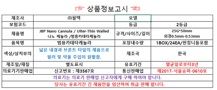 > JBP 나노캐뉼라 25G X 50mm 멸균 범용카테타 캐뉼라 소분 1EA