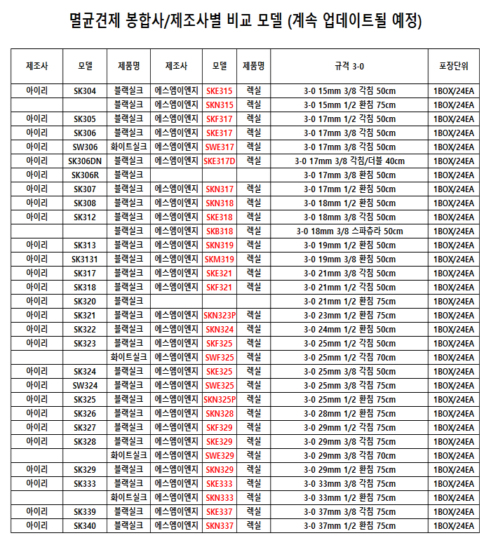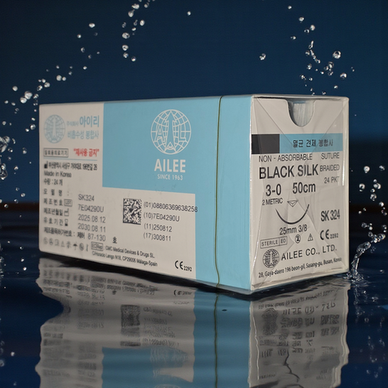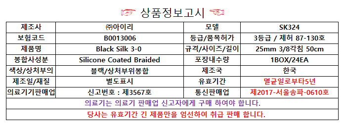 - HOME > 봉합사(침)/수술용실 > 멸균견재/비흡수성봉합사 > USP 3-0 > 아이리 SK324 블랙실크 3-0 25mm 3/8 리버스컷팅50cm 비흡수성봉합사 수술용실