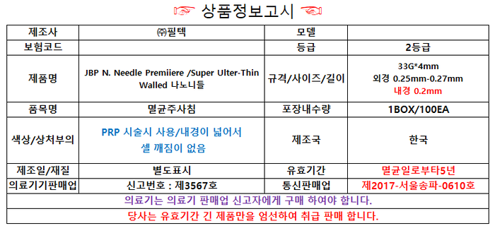 일반 나노니들보다 내경이 넓어져서 PRP시술시 유리함.