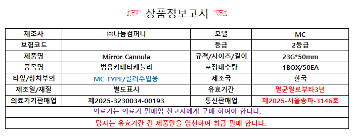 - HOME > 나노캐뉼라/나노니들 > 나노캐뉼라 > 23G > 나눔 나노 미러 캐뉼라 23G x 50mm 필러주입 일회용 멸균 범용 카테타 50EA