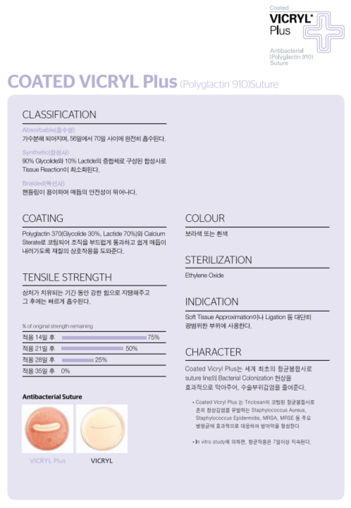흰색 색상의 흡수성 봉합사로 박테리아를 억제하는 안티박테리아 기능이 탑재되어 있습니다.