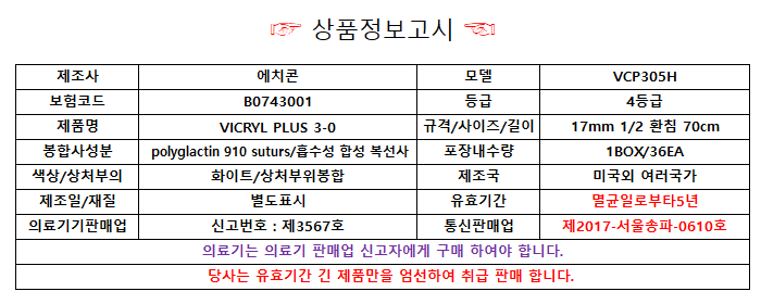 - HOME > 봉합사(침)/수술용실 > 폴리글락틴/흡수성봉합사 > USP 3-0 > 에치콘 VCP305H 바이크릴플러스 3-0 17mm 1/2 환침 70cm UL-202